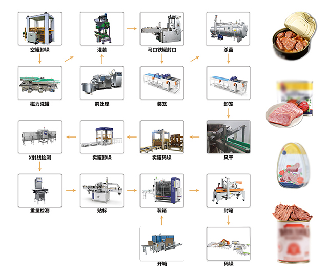 肉罐頭的生產(chǎn)工藝主要包括以下幾個步驟:原料處理、切塊、復檢、拌料、裝罐、排氣密封、殺菌冷卻、擦罐入庫。每一步都是確保產(chǎn)品質(zhì)量的重要環(huán)節(jié)。